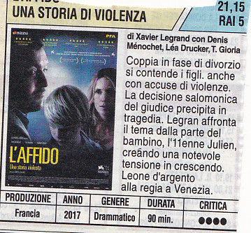20 Ago 202025 Mag 2022 Paolo Ferrario L’AFFIDO. Regia di Xavier Legrand, con Denis Ménochet, Léa Drucker, Thomas Gioria, Mathilde Auneveux, Mathieu Saikaly, Francia 2017, Francia 2017 trama in https://it.wikipedia.org/wiki/L%27affido_-_Una_storia_di_violenza recensione di Maurizio Porro in http://cinema-tv.corriere.it/cinema/porro/18_giugno_22/affido-7a18827a-75a7-11e8-bb6c-d710a4e0e531.shtml Leggi su Mymovies Condividi: Fai clic per condividere su Facebook (Si apre in una nuova finestra) Facebook Fai clic qui per condividere su LinkedIn (Si apre in una nuova finestra) LinkedIn Fai clic qui per condividere su Tumblr (Si apre in una nuova finestra) Tumblr Fai clic per condividere su WhatsApp (Si apre in una nuova finestra) WhatsApp Fai clic per inviare un link a un amico via e-mail (Si apre in una nuova finestra) E-mail Fai clic qui per stampare (Si apre in una nuova finestra) Stampa Fai clic qui per condividere su Pinterest (Si apre in una nuova finestra) Pinterest Fai clic per condividere su Threads (Si apre in una nuova finestra) Threads Fai clic per condividere su Bluesky (Si apre in una nuova finestra) Bluesky Mi piace Caricamento... Correlati