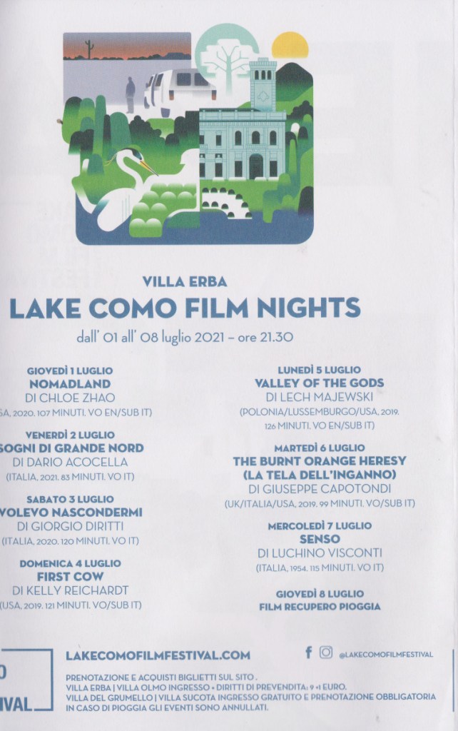 Como, 29 giugno 2021 – Le prime 7 proiezioni del Lake Como Film Festival – nella nuova declinazione che è “La Riva del Cinema” – prende il via a Villa Erba con la sezione indicata come LAKE COMO FILM NIGHTS, seguendo le orme degli ultimi 3 anni, con un programma che inizia giovedì 1 luglio e prosegue fino a giovedì 8 luglio (film recupero in caso di pioggia).