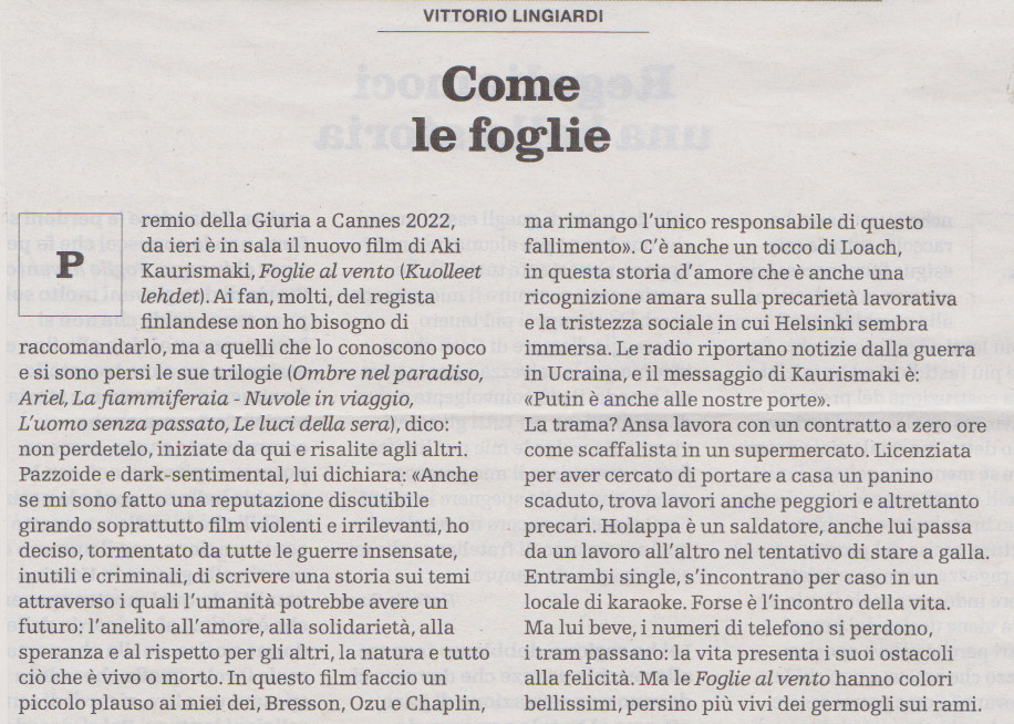 25 Mar 20241 Giu 2025 Paolo Ferrario FOGLIE AL VENTO, di Aki Kaurismaki, con Alma Pöysti, Jussi Vatanen, 2023 vai a queste schede del film: https://www.mescalina.it/cinema/recensioni/aki-kaurismki/foglie-al-vento?fbclid=IwAR142G4QA7iIDECNDPK90pAQ6JKtxj0QvzrQ-UsYHqo3b1T1rwiJXTifXxA https://www.ilsole24ore.com/art/film-uscita-cosa-vedere-cinema-fine-settimana-AFQihS9B https://www.fatamorganaweb.it/foglie-al-vento-di-aki-kaurismaki Condividi: Fai clic per condividere su Facebook (Si apre in una nuova finestra) Facebook Fai clic qui per condividere su LinkedIn (Si apre in una nuova finestra) LinkedIn Fai clic qui per condividere su Tumblr (Si apre in una nuova finestra) Tumblr Fai clic per condividere su WhatsApp (Si apre in una nuova finestra) WhatsApp Fai clic per inviare un link a un amico via e-mail (Si apre in una nuova finestra) E-mail Fai clic qui per stampare (Si apre in una nuova finestra) Stampa Fai clic qui per condividere su Pinterest (Si apre in una nuova finestra) Pinterest Fai clic per condividere su Threads (Si apre in una nuova finestra) Threads Fai clic per condividere su Bluesky (Si apre in una nuova finestra) Bluesky Mi piace Caricamento... Correlati