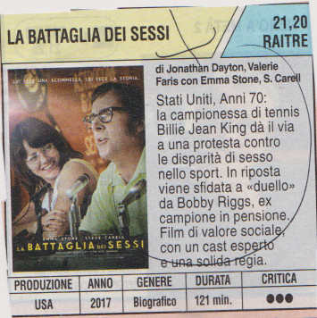 LA BATTAGLIA DEI SESSI, di Jonathan Dayton, Valerie Farls, con Emma Stone, S. Carrell, 2017